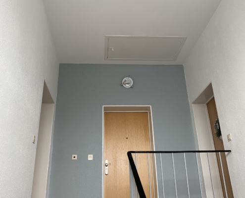 Treppenhaus bekam einen neuen Anstrich und die Wände wurden mit Seidenglanzlatex gestrichen. Auch das Geländer bekam einen neuen Anstrich.