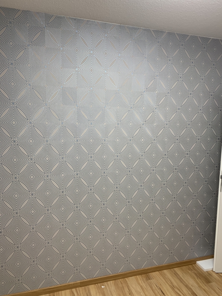 Reparaturarbeiten vordere Gipskartonplatte ausgeschnitten und ein neues Stück eingepasst, verspachtelt sowie geschliffen und eine neue Bahn der Mustertapete eingesetzt.