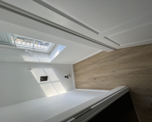 Alle Wände wurden von alter Tapete restlos befreit und anschließend grundiert sowie glatt gespachtelt und geschliffen. Im Anschluss wurde auf den Decken und Wänden ein Glasfaserfließ in Kleber eingebettet und nach dem trocken im gewünschten Farbton gestrichen.